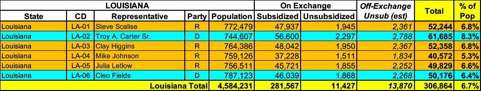 Louisiana has around ~293,000 residents enrolled in ACA exchange plans, 96% of whom are currently subsidized. I estimate they also have another ~13,000 unsubsidized off-exchange enrollees.